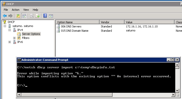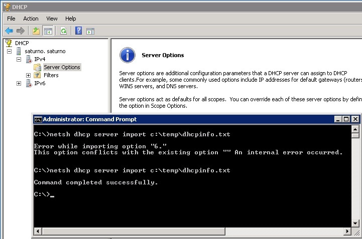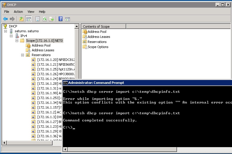 Borradas las opciones, el comando ejecutará correctamente, y luego podremos refrescar la MMC del DHCP con F5 para ver los datos importados.