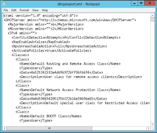 Sería extenso mostrar aqui todo el proceso, pero para cotejar archivos, en el nuevo DHCP generamos una estructura básica, scope, reservation, etc. y exportamos.., con ello tenemos un archivo para comparar con el ya generado dhcpexport.xml