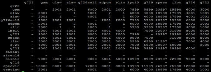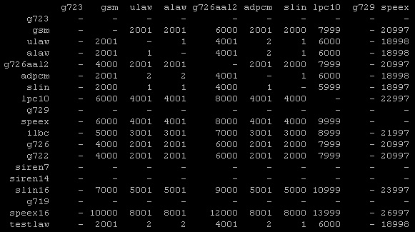 Observen aqui la linea referente al codec g729 (el que pusismos en nuestra configuración como preferido).. la linea no tiene valores de conversión, lo que indica que el codec o está instalado o bien no está funcionando.